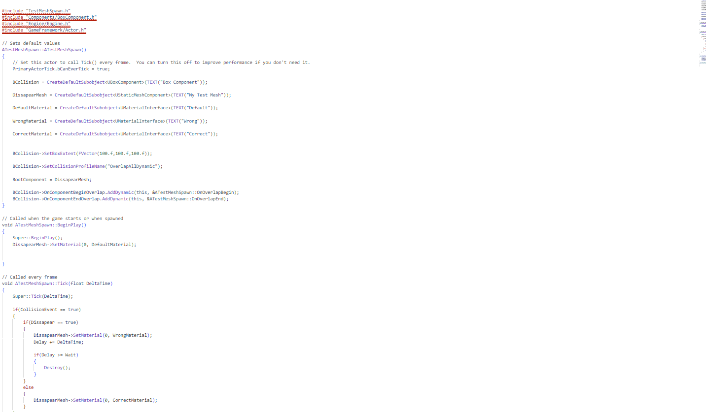 The script that will be discussed here is used to create disappearing platforms, obstacles where if the player stands on them they can either disappear or remain. The reason that this is the script that I wanted to highlight was because it was the first C++ script in Unreal that I created outside the tutorial that I was following, and completed based on my own research and experimentation. Yes, this script is very simple, but it was a small step in making me feel much more confident in my abilities with C++ in Unreal. I was tempted to also show my code for the Moving Platform scripts, but since they are basically the same as what was found in the tutorial, chose against it. The script for the disappearing platforms was created in a script named “TestMeshSpawn”, which, as the name implies, was originally a test on the script which ended up being exactly what I needed it to be.